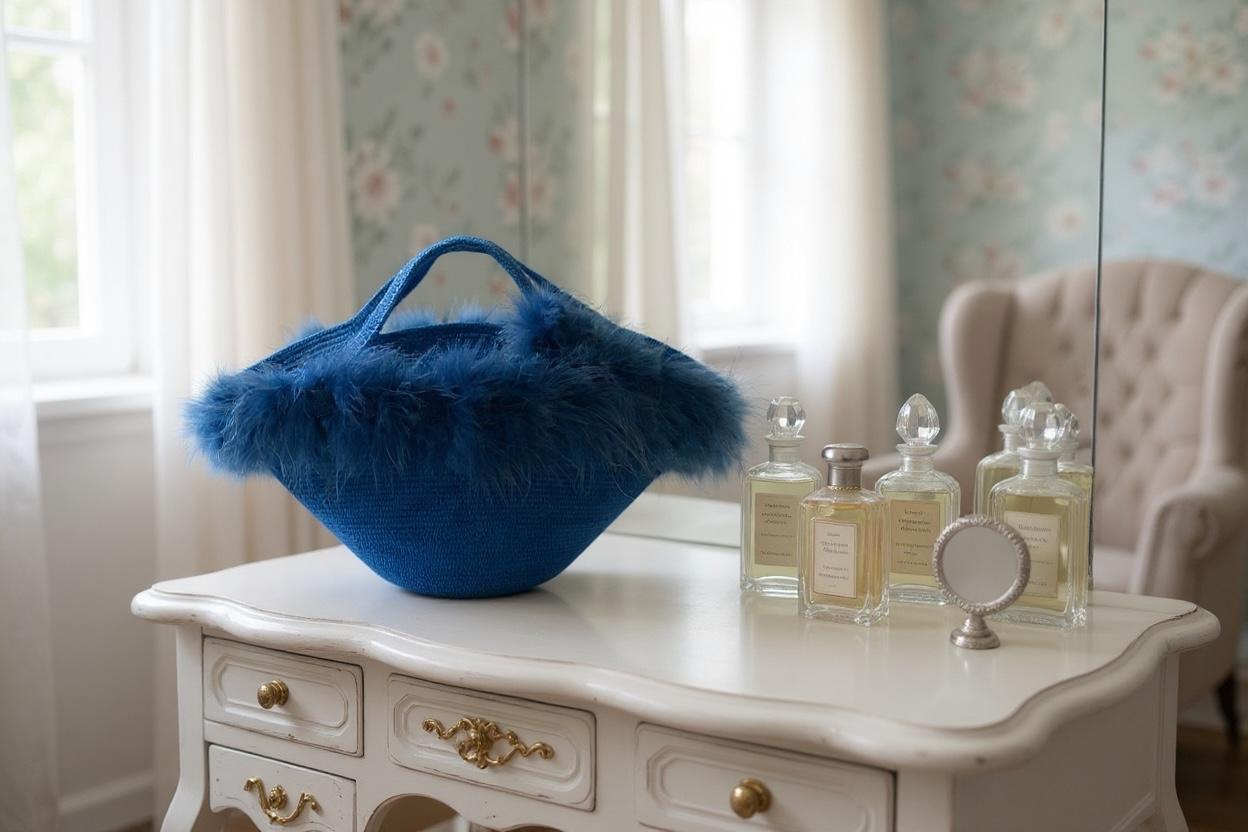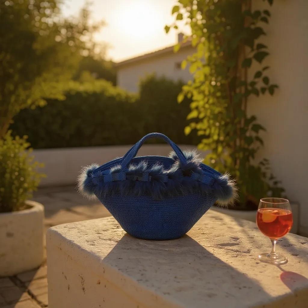 Borsa in rafia colore blu e grigio con fodera a coulisse made in Italy
